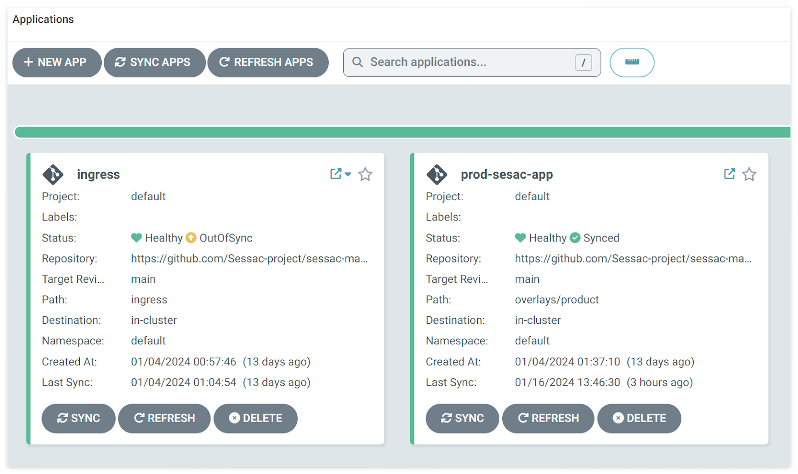 Ingress와 prod-sesac-app 두 개의 Application을 생성했습니다. Application은 배포하고자 하는 애플리케이션을 의미합니다. 각 애플리케이션은 Git repo 에서 가져온 정의를 기반으로 하며, Kubernetes 클러스터에 배포됩니다.