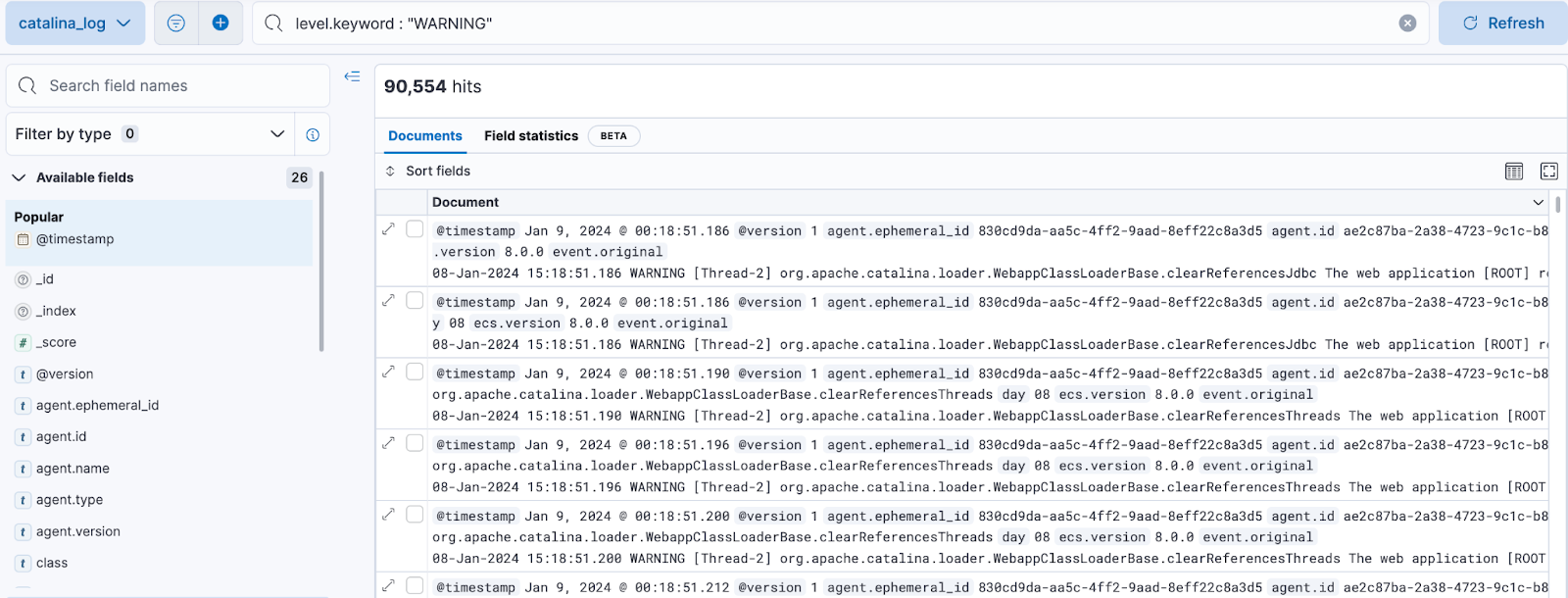 예를 들어, 로그레벨이 WARNING인 데이터만 검색하려면 level.keyword : “WARNING” 으로 검색할 수 있습니다.