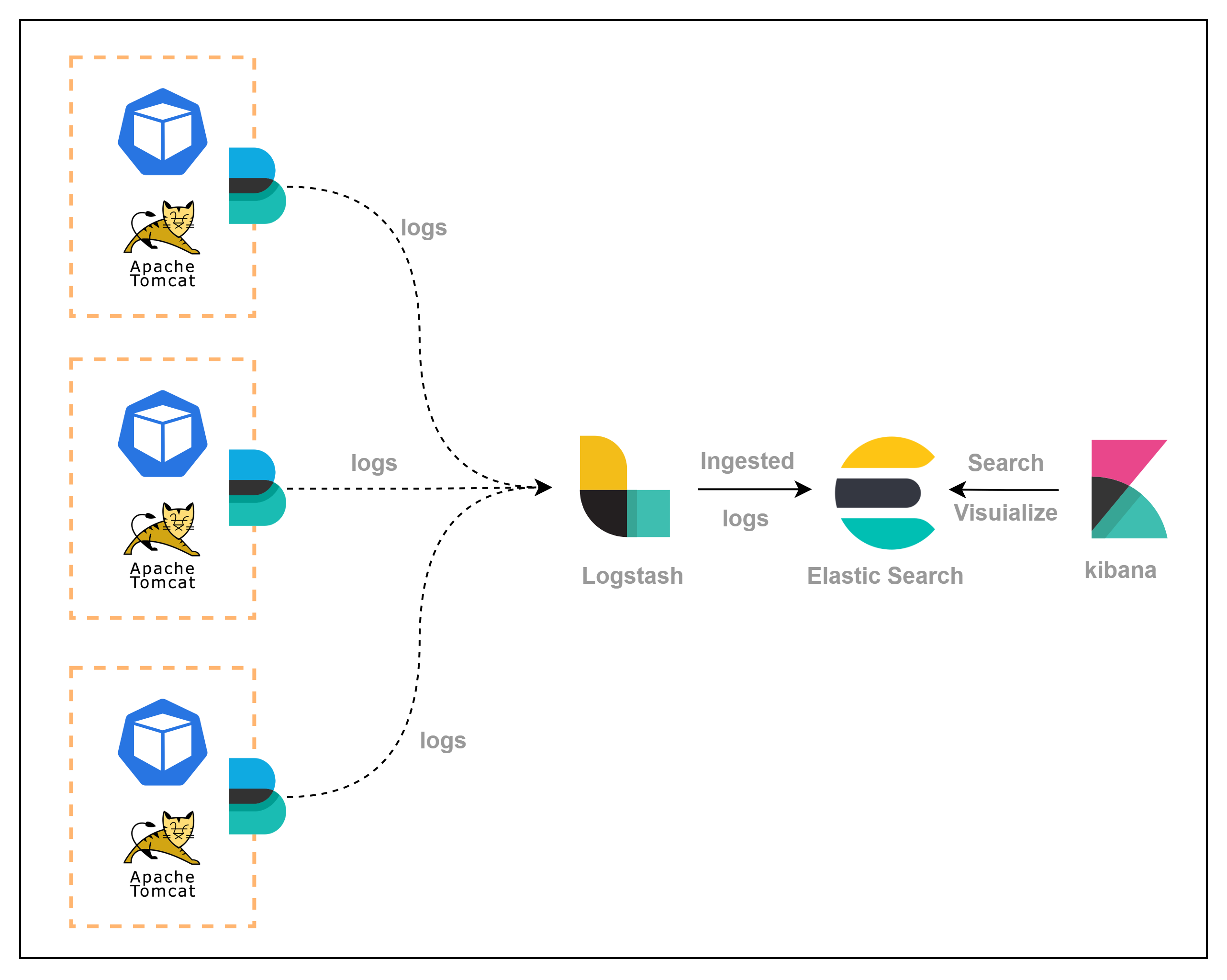 - 먼저 사이드카 컨테이너로 동작하는 filebeat 컨테이너가 Apache Tomcat의 로그를 수집하여 Logstash로 전송합니다.