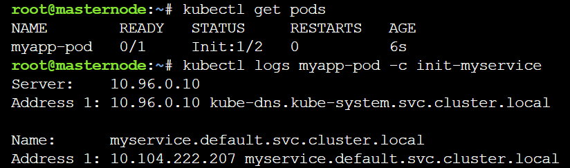 command: ['sh', '-c', "until nslookup myservice.$(cat /var/run/secrets/kubernetes.io/serviceaccount/namespace).svc.cluster.local; do echo waiting for myservice; sleep 2; done"]