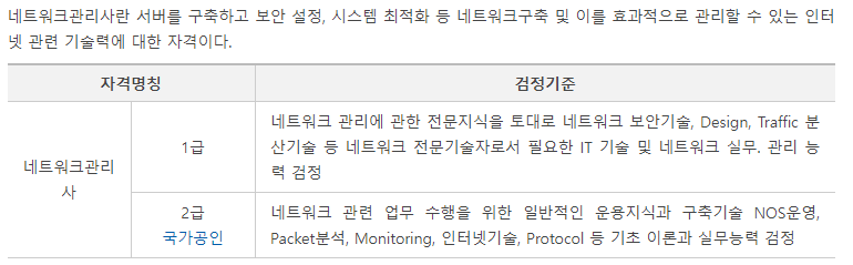개요 및 검정기준 네트워크관리사란 서버를 구축하고 보안 설정, 시스템 최적화 등 네트워크구축 및 이를 효과적으로 관리할 수 있는 인터넷 관련 기술력에 대한 자격이다. 자격명칭 검정기준