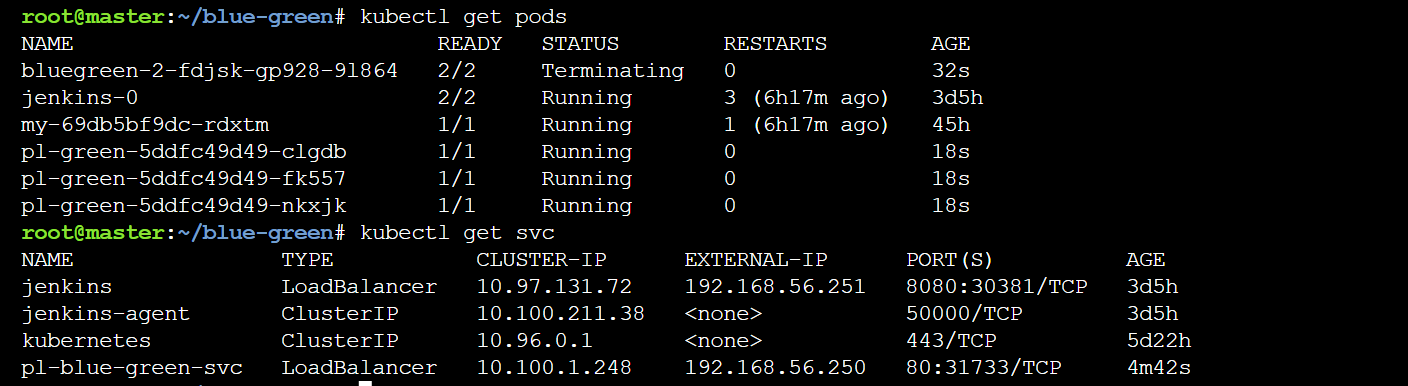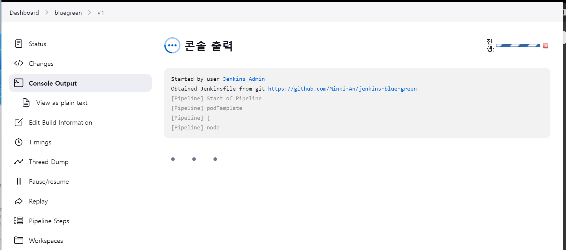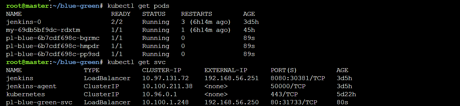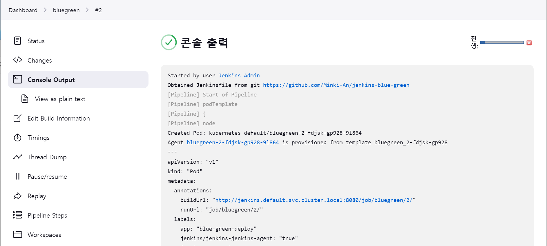 Jenkinsfile에 정의된 대로 blue 태그가 붙은 pods가 생성됩니다.