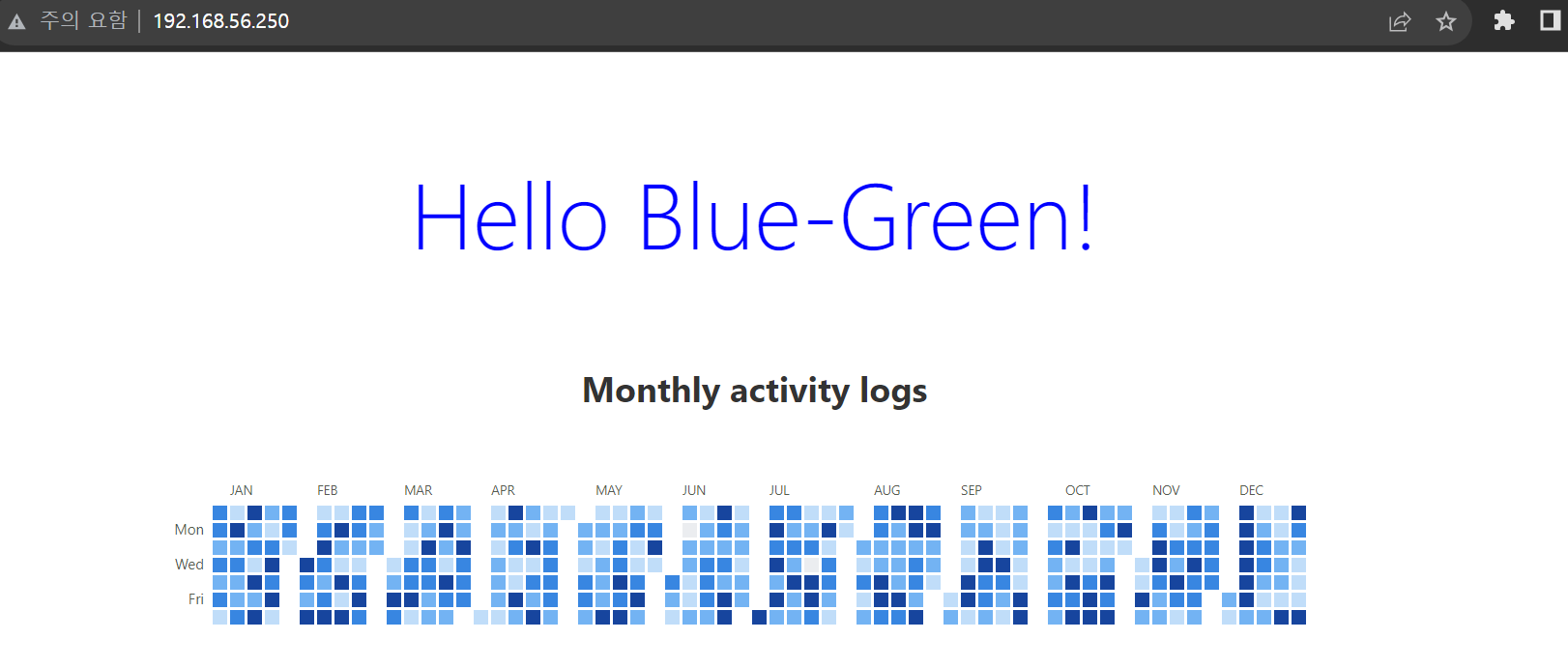 Metal LB로 접속해 결과를 확인해 줍니다. kustomize에 의해 blue 이미지를 태그를 가진 파드가 생성됩니다.