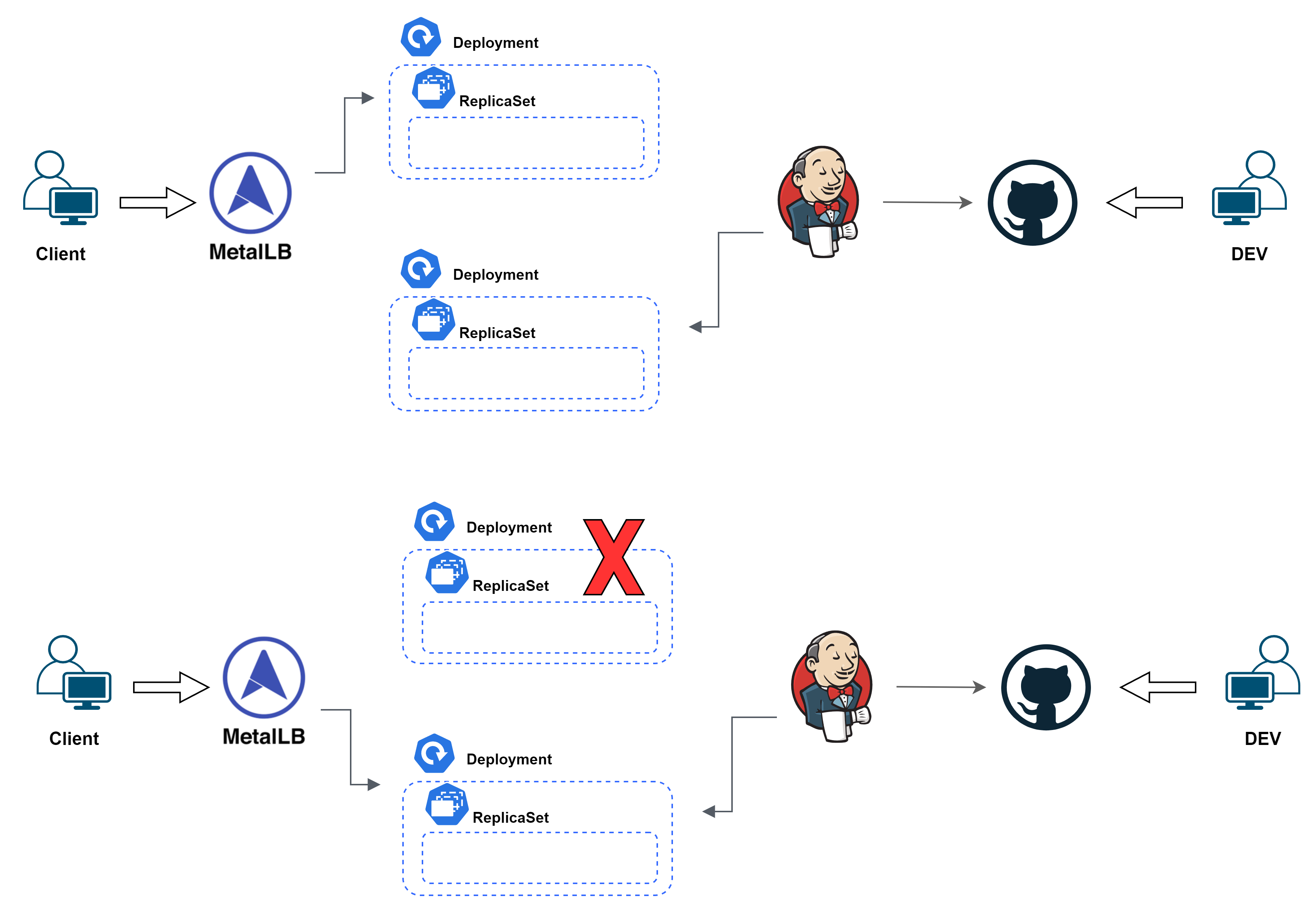 배포를 위한 Deployment를 생성해야 하기 때문에 2배 이상의 리소스가 필요하지만 장애복구가 용이하고, 무중단 배포가 가능하다는 장점이 있습니다.
