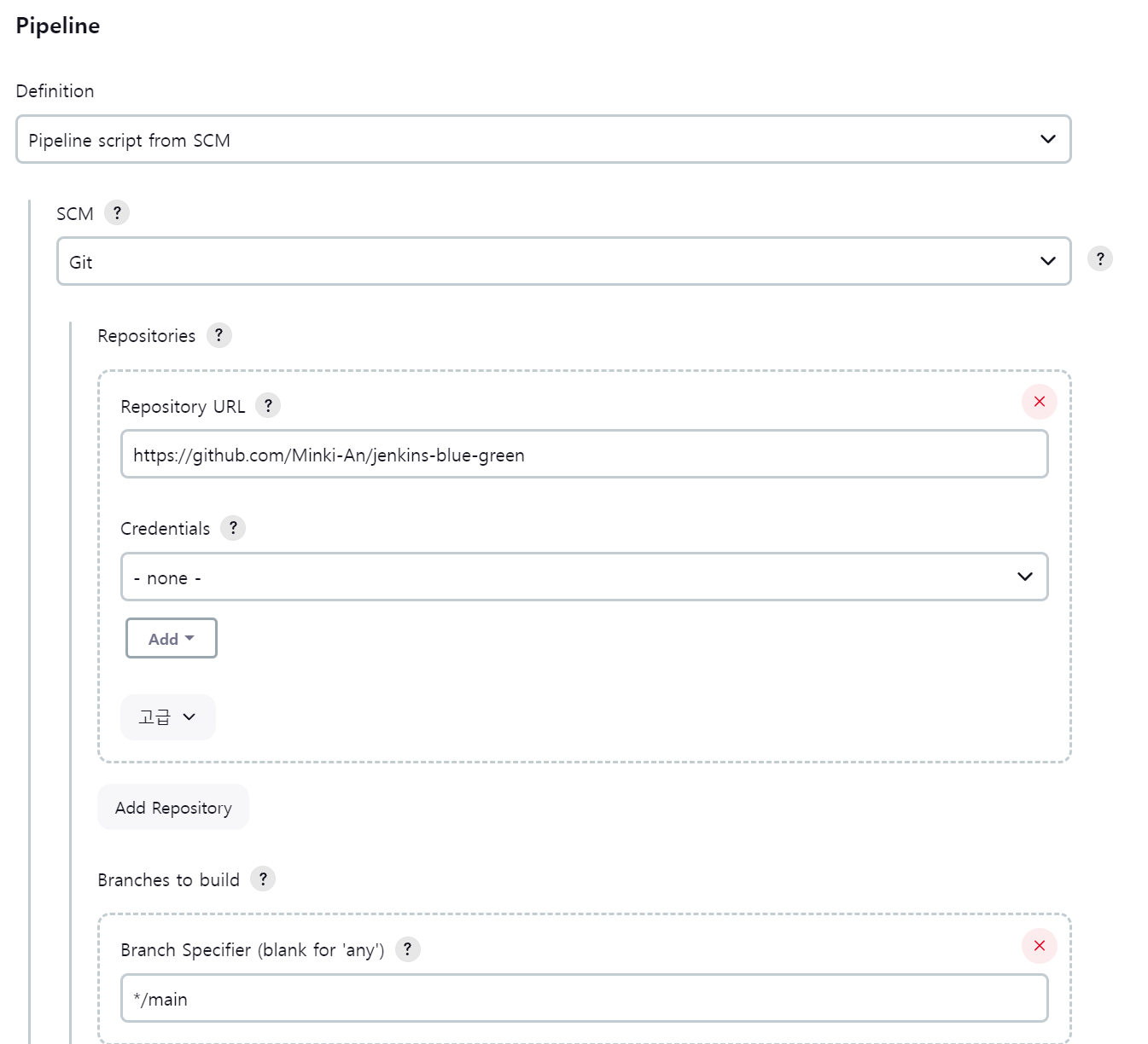 git url: 'https://github.com/IaC-Source/blue-green.git', branch: 'main'