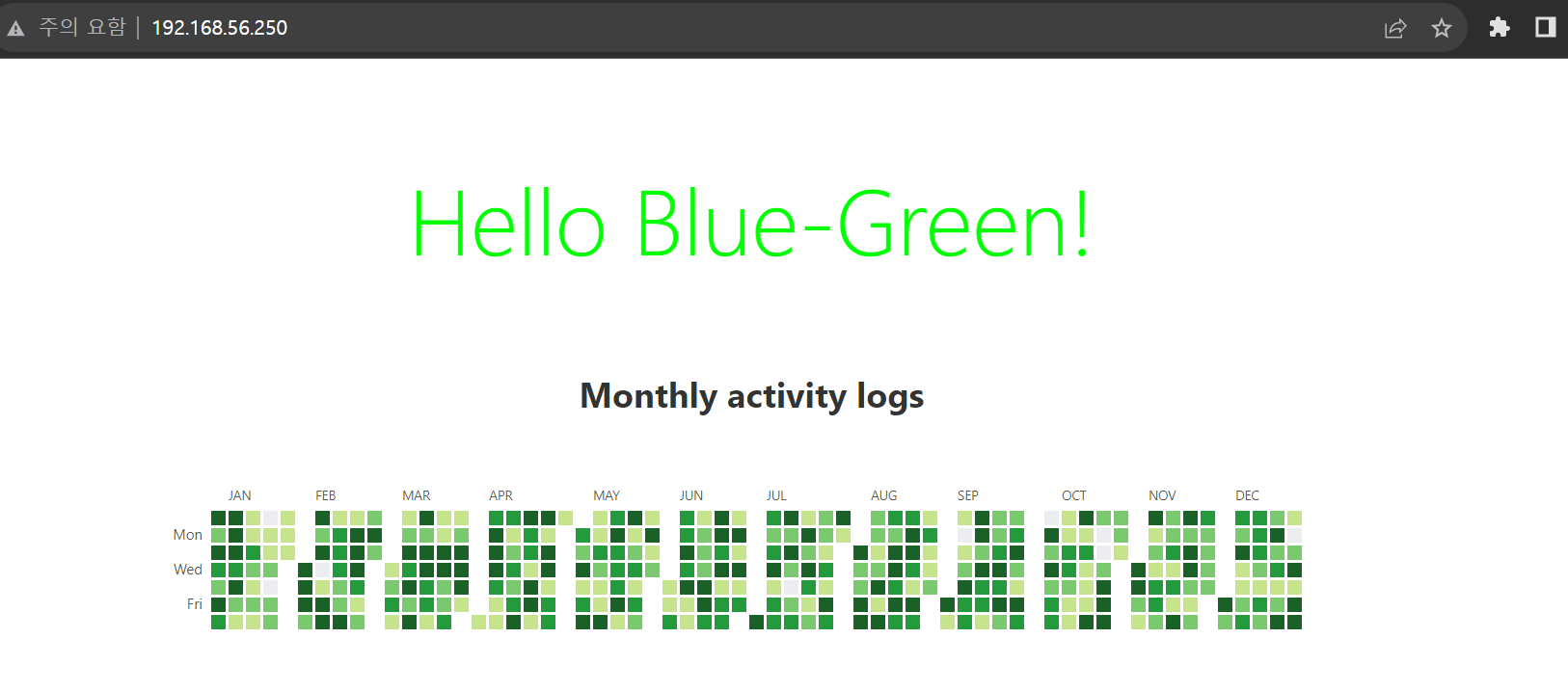 Metal LB로 접속해 결과를 확인해 줍니다. kustomize에 의해 green이미지로 파드가 생성되었습니다.