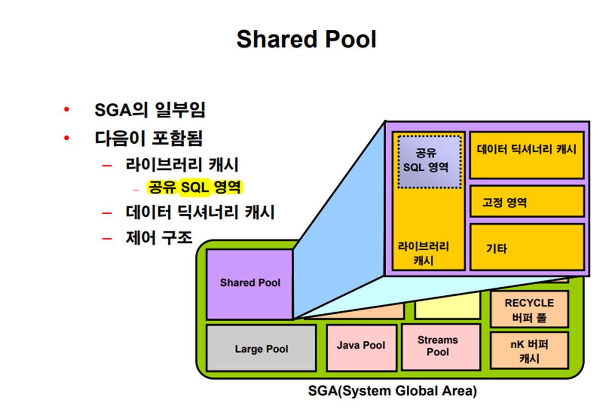 Shared Pool 은 SQL을 수행하는 과정에서 파싱의 역할을 수행합니다. 파싱을 수행함에 있어 빠르게 수행하여 자원사용을 최소화 하는 부분에 목적을 두고 있습니다.