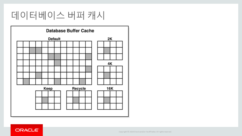 | 기본(Default) | 일반 데이터 버퍼 캐시를 의미하며 DB_CACHE_SIZE 파라미터에 의해 설정됩니다. 일반적인 테이블이나 인덱스는 기본 데이터 버퍼 캐시를 이용합니다. |
